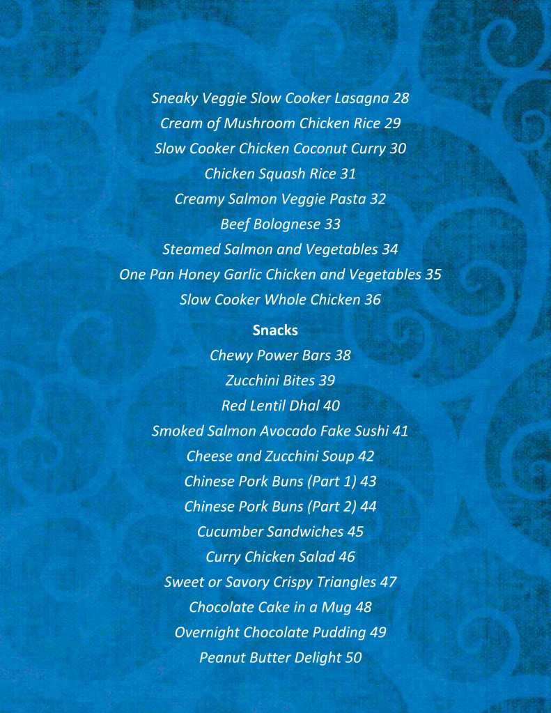 With over 50 children recipes for breakfast, lunch/dinner and extraordinary circumstances (when things are not going so well), there are lots of yummy options to choose from!